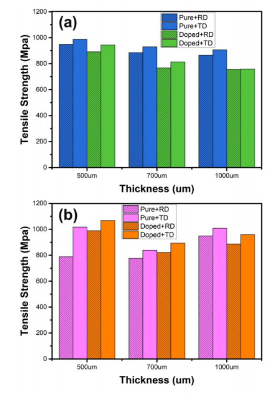 研究两种换向位置对交叉轧钼板织构和性能的影响,即热轧后换向和温轧后换向,取两种轧制方式的纯钼板,检测其拉伸性能(分别沿着轧制方向垂直于轧制方向的横向切割拉伸条,表征轧制方向和横向的拉伸性能,观察是否有区别),并用XRD检测方法探究这两种轧制方式钼板织构的组分和含量,探究力学性能和轧制方式 以及压下量的关系。