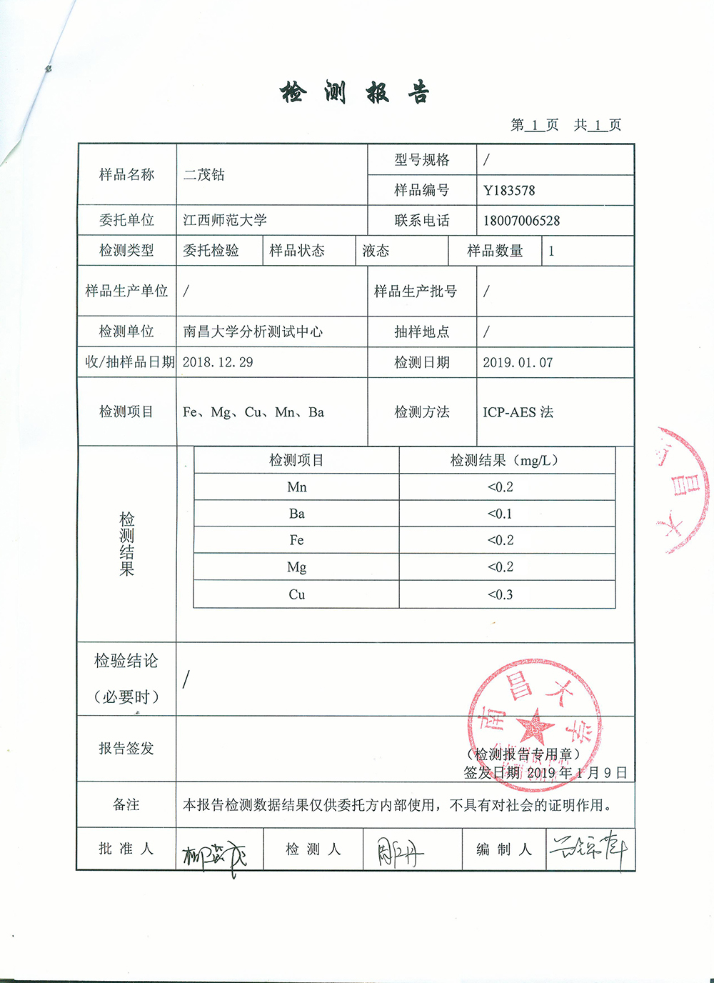 二茂钴中间体处理过程:先氧化,再用酸溶解成水溶液,稀释后进行测试,使用ICP仪器进行分析,来确保检测纯度的可靠性。