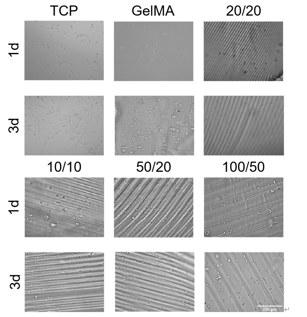 说明 : PC12细胞在GelMA水凝胶表面通道粘附的电镜扫描结果
