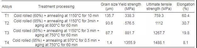 在一定温度时效后,具有L12有序结构的Ni3(Al,Ti)型第二相在面心立方(FCC)基体中均匀析出,并与FCC基体共格。通过热机械处理过程,合金的屈服强度从338.3 MPa增加到1355.9 MPa,抗拉强度从759.3 MPa增加到1488.1 MPa,而伸长率仍然保持在8.1%(详见下表1)。