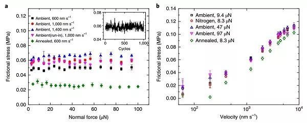 (a)不同滑动速度下,负载对石墨/六方氮化硼异质结节界面摩擦力的影响