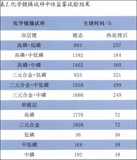 作者认为,高磷和镍锡磷化学镀镍层耐蚀性优良,但耐磨损性能较差,可作底镀层;低磷化学镀镍具有较高的镀态硬度,以其作为面镀层,可兼顾耐蚀和耐磨性能。高光亮的化学镀镍多半为中磷或中低磷化学镀镍,以其作为面镀层可满足对于镀件的装饰性要求。作者采用冷轧钢板试片,镀厚25μm,若双镀层,则为底镀层15μm,面镀层I0μm。试样中性盐雾试验结果如表2所示。