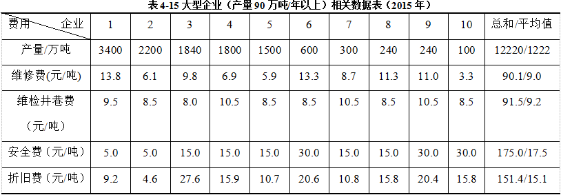 由表4-15、表4-16及表4-17可得:30家煤炭企业的2015年维修费、维检费及井巷费、安全费以及折旧费如表4-18、表4-19和表4-20所示: