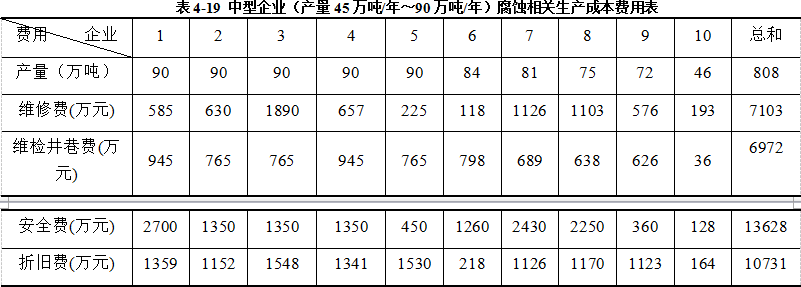 根据三种类型企业的生产成本投入对比可知,三种类型的企业的维修费、维检及井巷费、设备折旧费的投入情况差别不大,但是考虑到三种类型的企业产量产别很大,可以看出小型煤矿企业由于维修费、维检及井巷费以及折旧费的投入占据了其产值的较大比例,尽管煤矿企业设施的腐蚀并非是造成这些费用投入的唯一因素,但也可以从一定程度上显示出小型煤矿由于腐蚀而造成的经济损失相对更大一些。通过三种类型企业的安全费投入情况的对比,可以看出小型煤矿由于其管理上的疏忽,生产设备以及技术的落后,导致其安全生产成本较高,面临的由于腐蚀所造成的问题也更严峻。