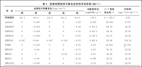 从表3和表4可以看出:经氧化与腐蚀安定性评定,包含有合成抗氧剂的多元醇酯润滑油在204℃氧化前后总酸值变化为0.945mgKOH.g,40℃运动黏度变化率为10.026%,沉积物含量为2.537mg/(100mL);在218 ℃氧化前后总酸值变化为4.49mgKOH/g,40℃运动黏度变化率为21.76%,沉积物含量为3.444 2mg/(100mL)。synaxo1氧化前后总酸值变化。40℃运动黏度变化率。沉积物生成量较常规抗氧剂均减少50%以上,高温抗氧化性能优异,显著提高了酯类润滑油的高温腐蚀与氧化安定性,能够满足航空润滑油AS-5780A和MIL-PRF-23699F对航空润滑油高温腐蚀与氧化安定性性能要求。