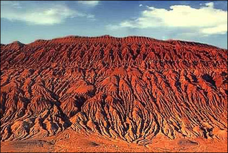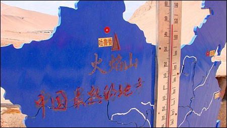 吐鲁番位于新疆天山东部山间盆地中,有2000多平方公里是低于海平面100米以下的低地。盆地热气积聚,难以与外界空气交换,所以异常炎热。 在此测得49.7摄氏度。创历史上最高气温纪录,而地表最高温度竟达85.3摄氏度。