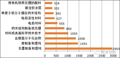 图3与图4分别为石墨烯主要专利技术研究领域的分布,从分类中获得。石墨烯的制备及处理和电极应用为主要研究方向。