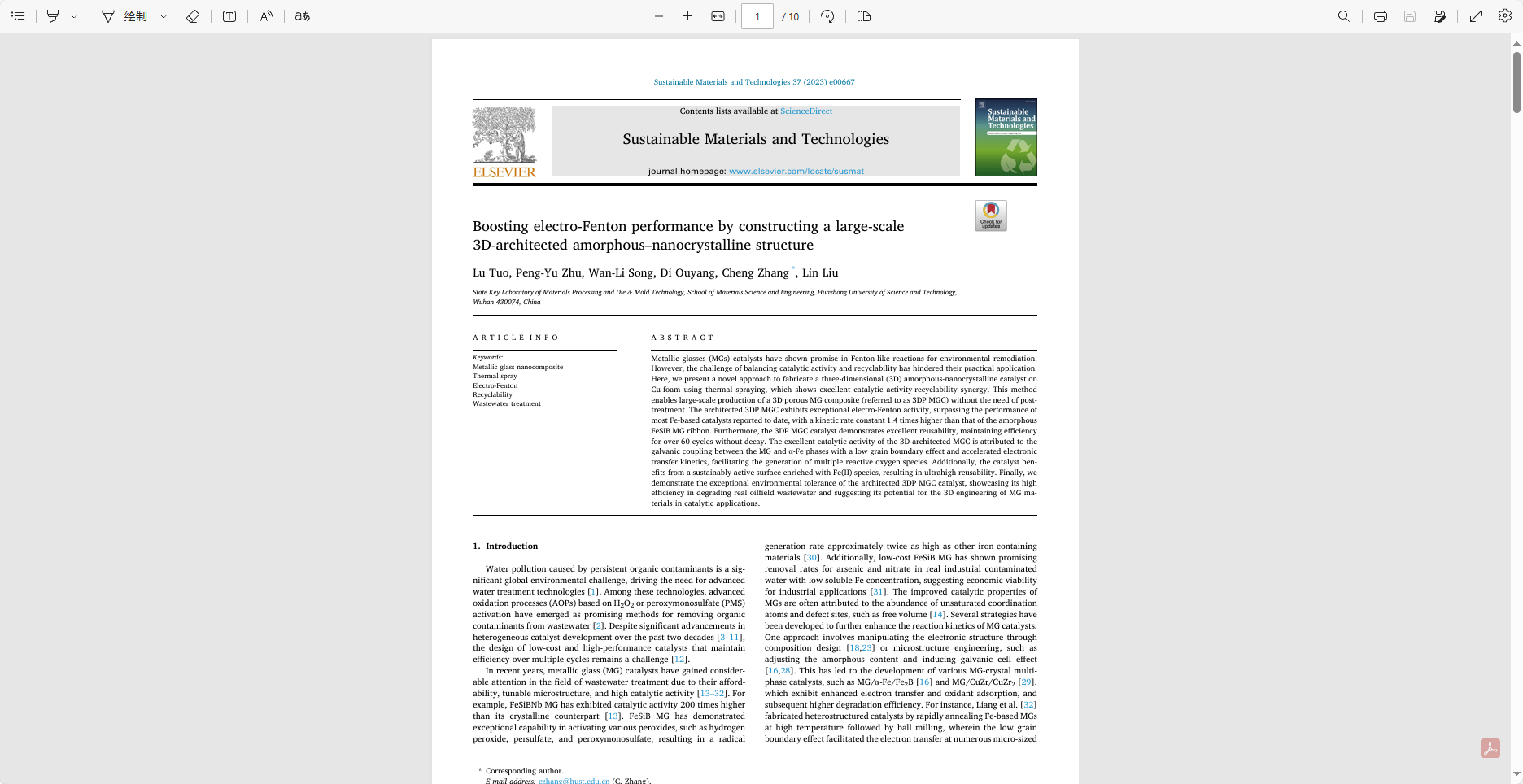 金属玻璃(mg)催化剂在类芬顿反应中具有良好的应用前景。然而,平衡催化活性和可回收性的挑战阻碍了它们的实际应用。在此,我们提出了一种利用热喷涂技术在泡沫铜上制备三维(3D)非晶纳米晶催化剂的新方法,该方法具有优异的催化活性和可回收性协同作用。该方法可以大规模生产3D多孔MG复合材料(称为3DP MGC),而无需后处理。构建的3DP MGC具有优异的电芬顿活性,超过了迄今为止报道的大多数铁基催化剂的性能,其动力学速率常数比非晶FeSiB MG带高1.4倍。此外,3DP MGC催化剂表现出优异的可重复使用性,在60多个循环中保持效率而不会衰变。3d结构的MGC具有优异的催化活性,这是由于MG和α-Fe相之间的电偶联,具有低晶界效应和加速的电子转移动力学,促进了多种活性氧的生成。此外,该催化剂具有持续活性的表面,富含Fe(II),从而具有超高的可重复使用性。最后,我们展示了构建的3DP MGC催化剂的卓越环境耐受性,展示了其对实际油田废水的高效降解,并表明其在MG材料的3D工程催化应用中的潜力。