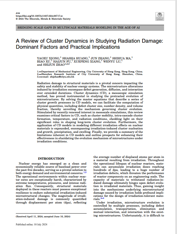 结构材料的辐射损伤是影响核能系统安全与稳定的关键问题。辐照引起的微观结构变化包括缺陷的产生、扩散和长时间的相互作用。聚类动力学(CD)作为一种介观模拟方法,已被证明是研究微观结构长期演化的工具。通过求解CD模型中描述一系列簇生长过程的主方程,我们可以方便地计算物理量,包括缺陷簇大小、数量密度和体积分数,从而揭示控制簇演化的机制。受最近对中尺度模拟的重新关注,本综述研究了CD的关键因素,如簇迁移、级联内簇形成、温度和辐射条件,揭示了它们在形成长期簇演变中的重要作用。此外,还阐述了CD模型在模拟辐照对核材料的不同影响中的应用,包括辐照诱导团簇成核和生长、沉淀和膨胀。最后,我们总结了CD模型固有的局限性,并展望了提高其在阐明辐照条件下微观结构演化机制方面的有效性的前景。