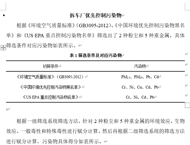 根据《环境空气质量标准》(GB3095-2012)、《中国环境优先控制污染物黑名单》和《US EPA重点控制污染物名单》筛选出了2种粉尘和5种重金属。具体筛选条件对应污染物如表所示。