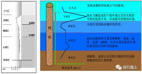 下图是钢桩在不采取防护情况下,在不同海洋环境中的腐蚀分析(取自防腐专家、侯宝荣院士报告)