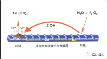形成“腐蚀电池”:Cl-破坏钝化膜使钢筋表面这些部位(点)露出了铁基体,与尚完好的钝化膜区域之间构成电位差(作为电解质,混凝土内一般有水或潮气存在)。腐蚀往往由局部开始逐渐在钢筋表面扩展;