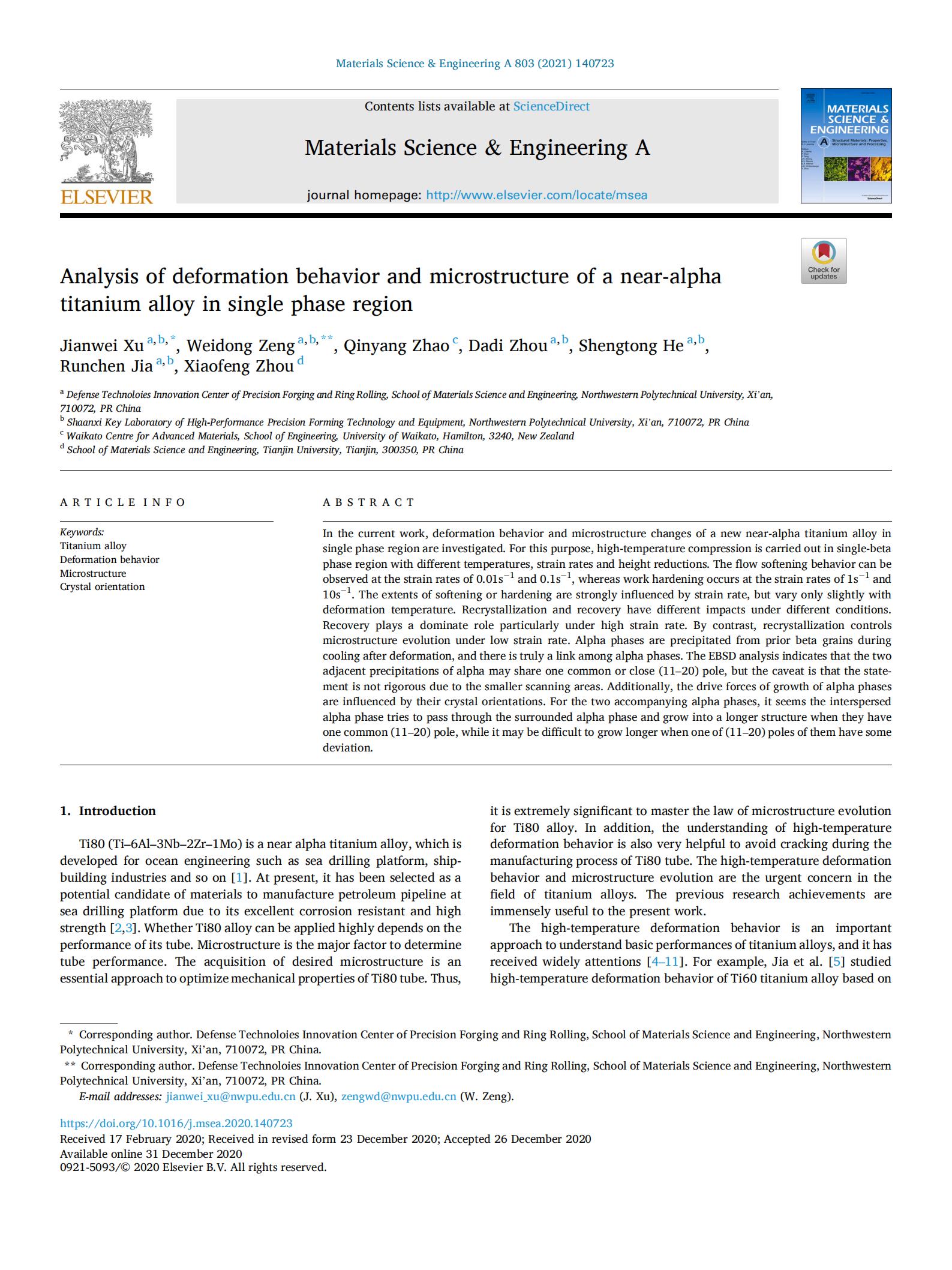 In the current work, deformation behavior and microstructure changes of a new near-alpha titanium alloy in single phase region are investigated. For this purpose, high-temperature compression is carried out in single-beta phase region with different temperatures, strain rates and height reductions. The flow softening behavior can be observed at the strain rates of 0.01s−1 and 0.1s−1, whereas work hardening occurs at the strain rates of 1s−1 and 10s−1. The extents of softening or hardening are strongly influenced by strain rate, but vary only slightly with deformation temperature. Recrystallization and recovery have different impacts under different conditions. Recovery plays a dominate role particularly under high strain rate. By contrast, recrystallization controls microstructure evolution under low strain rate. Alpha phases are precipitated from prior beta grains during cooling after deformation, and there is truly a link among alpha phases. The EBSD analysis indicates that the two adjacent precipitations of alpha may share one common or close (11–20) pole, but the caveat is that the statement is not rigorous due to the smaller scanning areas. Additionally, the drive forces of growth of alpha phases are influenced by their crystal orientations. For the two accompanying alpha phases, it seems the interspersed alpha phase tries to pass through the surrounded alpha phase and grow into a longer structure when they have one common (11–20) pole, while it may be difficult to grow longer when one of (11–20) poles of them have some deviation.