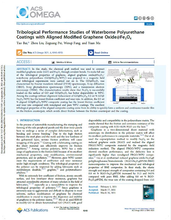 在这项研究中,化学接枝方法用于通过共价键连接改性氧化石墨烯 (GO) 和 Fe3O4。为充分利用石墨烯的摩擦学特性,在磁场中制备了定向氧化石墨烯@Fe3O4/水性聚氨酯(GO@Fe3O4/WPU)并对其进行了摩擦学实验。通过傅里叶变换红外(FTIR)光谱、X射线衍射(XRD)、X射线光电子能谱(XPS)和透射电子显微镜(TEM)对GO@Fe3O4进行表征。表征结果表明,Fe3O4成功负载在GO表面,GO@Fe3O4在WPU中具有更好的分散性。在没有GO@Fe3O4取向诱导的涂层中,0.5wt%的GO@Fe3O4/WPU具有最低的摩擦系数和磨损率。此外,与未排列和纯 WPU 涂层相比,0.5 wt% 排列的 GO@Fe3O4/WPU 复合涂层具有最低的摩擦系数和磨损率。取向复合涂层优异的摩擦学性能来自于它能够在摩擦副上快速形成均匀连续的转移膜,避免摩擦副与涂层之间的直接摩擦。
