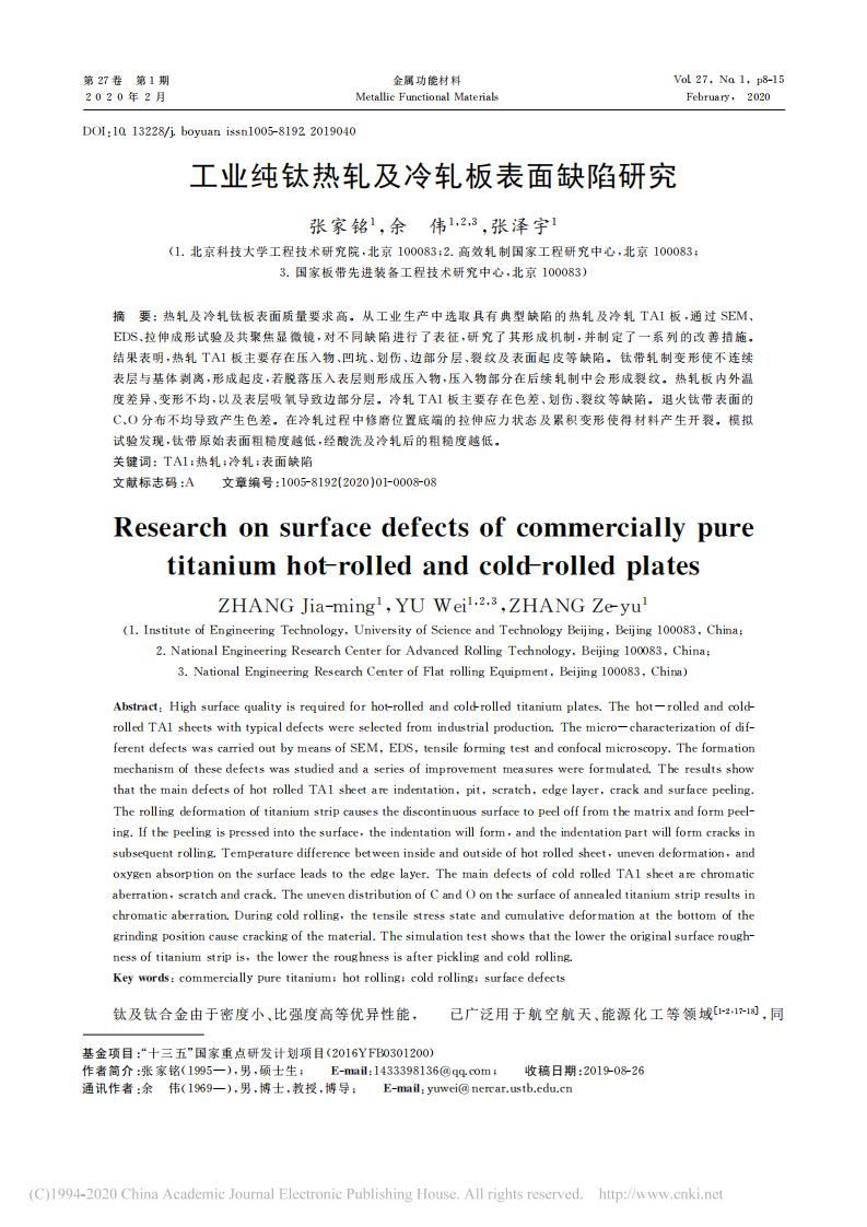 热轧及冷轧钛板表面质量要求高。从工业生产中选取具有典型缺陷的热轧及冷轧 TA1板,通过 SEM、