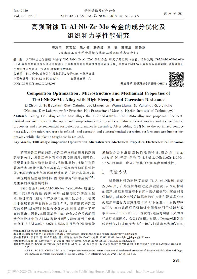 Taking Ti 80 ally as the base alloy,the Ti-5.5Al-3.0Nb-3.0Zr-1.2Mo alloy was proposed.The heattreated microstructure of theoptimized composition alloy presents a uniform basket-weave,and its mechanicalproperties and electrochemical corrosion performance is desirable.After adding 0.3Ni to the optimized component alloy,the microstructure is refined,adn strength and electrochemical corrosion performance are further improved,while the plastic toughness is reduced