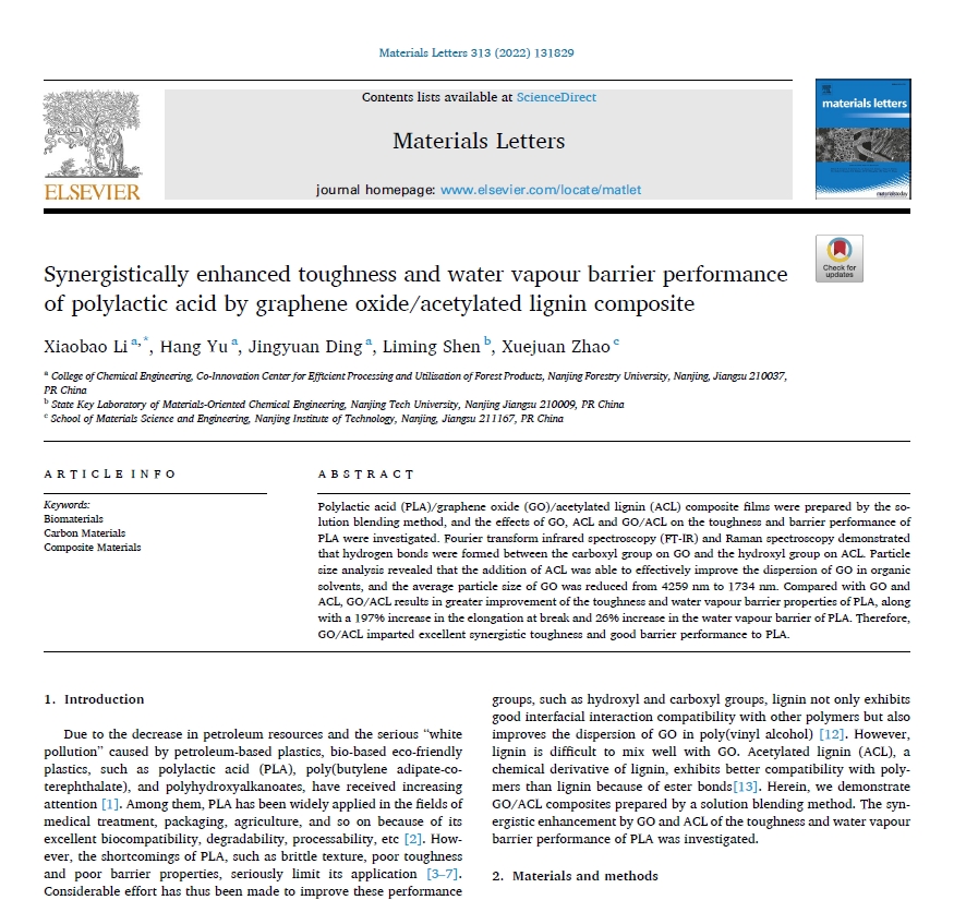 采用溶液共混法制备了聚乳酸(PLA)/氧化石墨烯(GO)/乙酰化木质素(ACL)复合膜,研究了GO、ACL和GO/ACL对聚乳酸韧性和阻隔性能的影响。傅立叶变换红外光谱(FT-IR)和拉曼光谱表明,GO上的羧基和ACL上的羟基之间形成了氢键。粒度分析表明,ACL的加入能够有效地改善GO在有机溶剂中的分散性,GO的平均粒度从4259nm减小到1734nm。与GO和ACL相比,GO/ACL显著提高了PLA的韧性和水蒸气阻隔性能,断裂伸长率提高了197%,水蒸气阻隔性提高了26%。因此,GO/ACL赋予PLA优异的协同韧性和良好的阻隔性能。