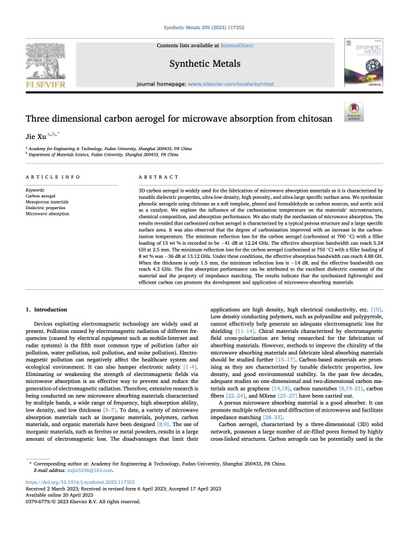 三维碳气凝胶具有介电性能可调、超低密度、高孔隙率和超大比表面积等特点,被广泛应用于微波吸收材料的制备。以壳聚糖为软模板,苯酚和甲醛为碳源,乙酸为催化剂,合成了酚醛气凝胶。探讨了炭化温度对材料微观结构、化学成分和吸收性能的影响。我们还研究了微波吸收的机理。结果表明,碳化碳气凝胶具有典型的多孔结构和较大的比表面积。还观察到碳化程度随着碳化温度的升高而提高。碳气凝胶的最小反射损耗(在700℃碳化◦C) 填充物负载为15wt%时,在12.24GHz时记录为−41dB。在2.5mm时,有效吸收带宽可达5.24GH。碳气凝胶(750℃碳化)的最小反射损耗◦ C) 填充物负载为8wt%时,在13.12GHz时为−36dB。在这些条件下,有效吸收带宽可以达到4.88 GH。当厚度仅为1.5毫米时,最小反射损耗为−14 dB,有效带宽可以达到4.2 GHz。这种良好的吸收性能可归因于材料优异的介电常数和阻抗匹配特性。结果表明,合成的轻质高效炭能促进吸波材料的发展和应用。