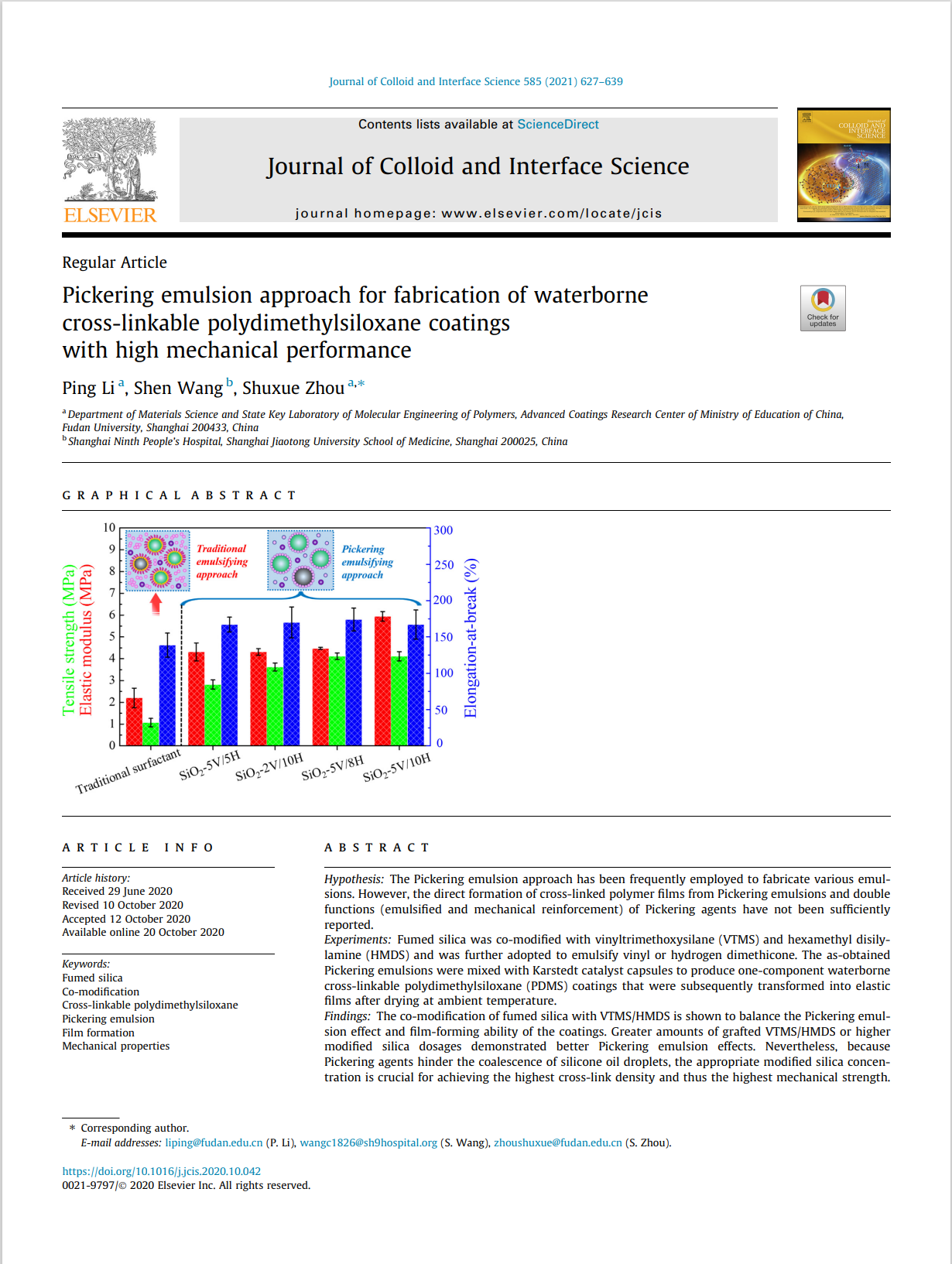 实验:气相二氧化硅与乙烯基三甲氧基硅烷(VTMS)和六甲基二硅胺(HMDS)共改性,并进一步用于乳化乙烯基或氢聚二甲基硅氧烷。将所得的Pickering乳液与Karstedt催化剂胶囊混合,生产出单组分水联聚二甲基硅氧烷(PDMS)涂层,在室温下干燥后转化为弹性膜结果表明:气相二氧化硅与VTMS/HMDS的共改性可以平衡Pickering乳液效应和涂层的成膜能力。接枝量越大的VTMS/HMDS或改性二氧化硅用量越大,Pickering乳液效果越好。然而,由于Pickering试剂会阻碍硅油液滴的聚结,因此适当的改性二氧化硅浓度对于实现最高的交联密度和最高的机械强度至关重要。接枝的C=C基团可以使改性二氧化硅具有氢化硅烷化反应性,从而进一步提高PDMS薄膜的力学性能。此外,Pickering乳液方法在获得具有高机械性能的水性涂料方面优于传统乳液方法。(c) 2020 爱思唯尔公司保留所有权利。