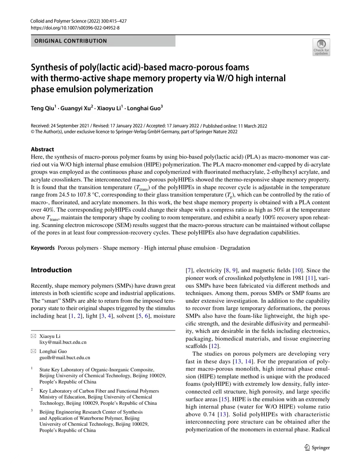 本文以生物基聚乳酸(PLA)为大孔单体,通过W/O高内相乳液(HIPE)聚合,合成了大孔聚合物泡沫。采用由二丙烯酸酯基团封端的PLA大分子单体作为连续相,并与氟化甲基丙烯酸酯、丙烯酸2-乙基己酯和丙烯酸酯交联剂共聚。互连的大孔聚HIPE显示出热响应形状记忆特性。研究发现,在形状恢复循环中,聚HIPE的转变温度(Ttrans)可在24.5至107.8℃的温度范围内调节,对应于其玻璃化转变温度(T2),这可以通过宏观单体、氟化单体和丙烯酸酯单体的比例来控制。在这项工作中,当PLA含量超过40%时,获得了最佳的形状记忆性能。相应的polyHIPE可以在高于Ttrans的温度下以高达50%的压缩比改变其形状,通过冷却到室温来保持临时形状,并且在再热时表现出接近100%的恢复。扫描电子显微镜(SEM)结果表明,在至少四个压缩-恢复循环中,可以保持宏观多孔结构而不会使孔隙坍塌。这些polyHIPE也具有降解能力。