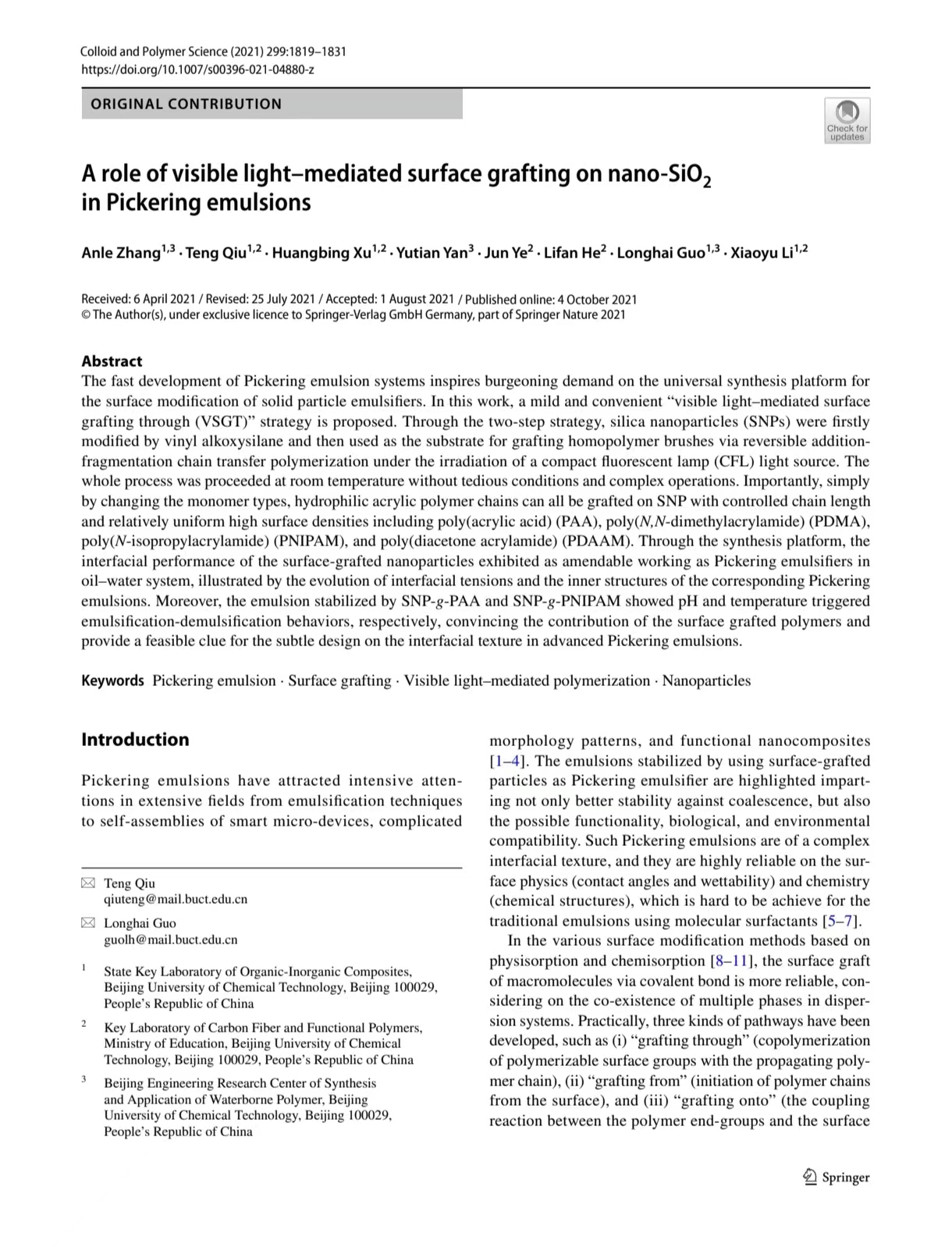 皮克林乳液体系的快速发展激发了对固体颗粒乳化剂表面改性通用合成平台的需求。在这项工作中,提出了一种温和方便的“可见光介导的表面接枝(VSGT)”策略。通过两步策略,首先用乙烯基烷氧基硅烷修饰二氧化硅纳米颗粒(SNPs),然后在紧凑型荧光灯(CFL)光源的照射下,通过可逆加成-断裂链转移聚合作为接枝均聚物刷的基质。整个过程在室温下进行,没有繁琐的条件和复杂的操作。重要的是,只要改变单体类型,亲水性丙烯酸聚合物链都可以接枝到SNP上,具有可控的链长和相对均匀的高表面密度,包括聚(丙烯酸)(PAA)、聚(N,N-二甲基丙烯酰胺)(PDMA)、聚异丙基丙烯酰胺(PNIPAM)和聚(二丙酮丙烯酰胺)(PDAAM)。通过合成平台,表面接枝的纳米颗粒在油水系统中表现出可作为Pickering乳化剂使用的界面性能,界面张力的演变和相应皮克林乳液的内部结构说明了这一点。此外,由SNP-g-PAA和SNP-g-PNIPAM稳定的乳液分别表现出pH和温度触发的乳化破乳行为,证明了表面接枝聚合物的贡献,并为高级皮克林乳液中界面织构的精细设计提供了可行的线索。