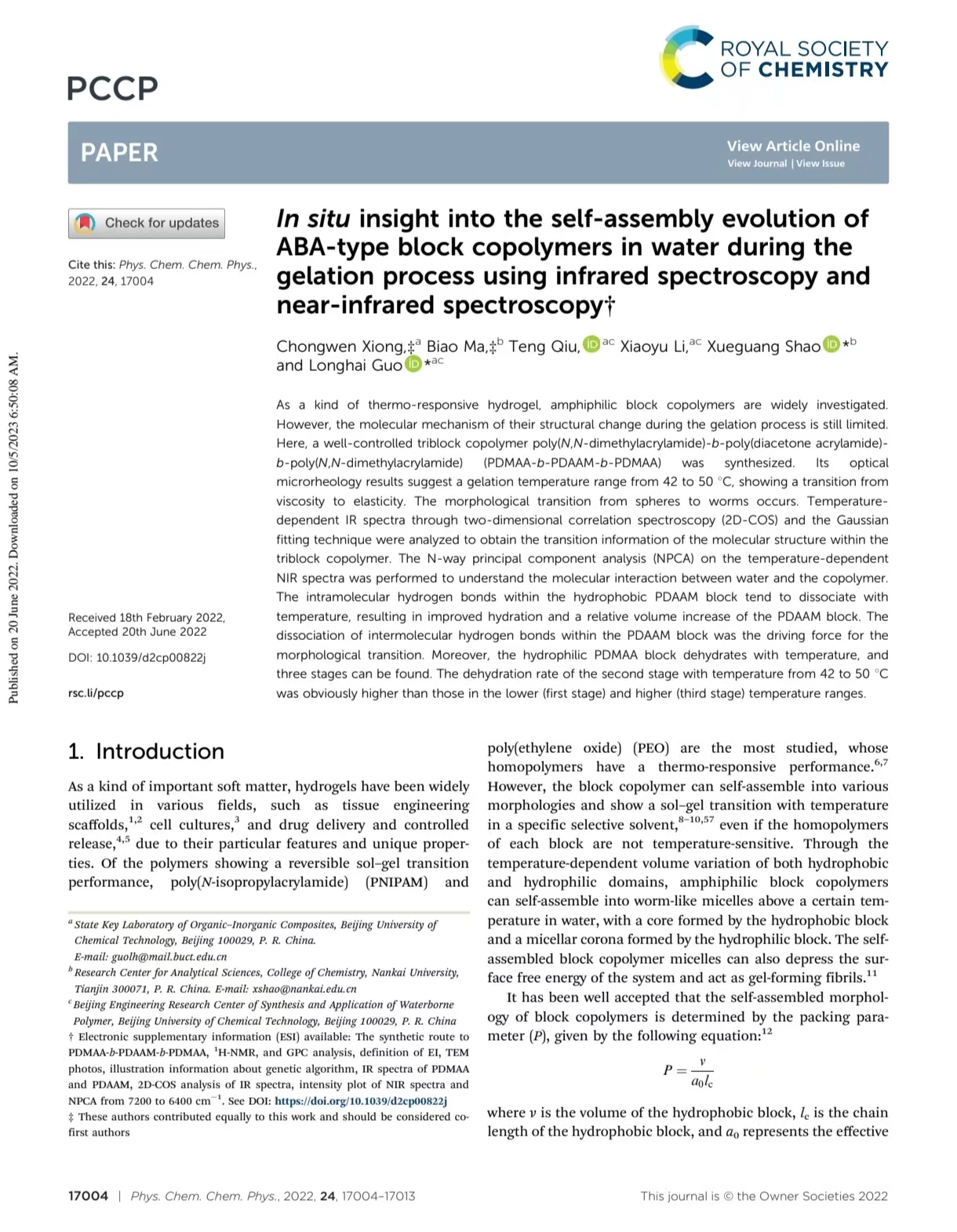 两亲性嵌段共聚物作为一种热响应性水凝胶得到了广泛的研究。然而,它们在凝胶化过程中结构变化的分子机制仍然有限。本文合成了一种控制良好的三嵌段共聚物聚(N,N-二甲基丙烯酰胺)-b-聚(二丙酮丙烯酰胺)-b-聚(N、N-二甲基酰胺)(PDMAA-b-PDAM-b-PDMAA)。其光学微流变学结果表明,凝胶化温度范围为42至50℃,显示出从粘度到弹性的转变。从球体到蠕虫的形态转变发生了。通过二维相关光谱(2D-COS)和高斯拟合技术分析了温度相关的红外光谱,以获得三嵌段共聚物内分子结构的转变信息。对温度相关的近红外光谱进行了N向主成分分析(NPCA),以了解水和共聚物之间的分子相互作用。疏水性PDAM嵌段内的分子内氢键倾向于随着温度的升高而离解,从而导致PDAM嵌块的水合作用改善和相对体积增加。PDAM嵌段内分子间氢键的解离是形态转变的驱动力。此外,亲水性PDMAA嵌段随着温度的升高而脱水,并且可以发现三个阶段。温度为42~50℃的第二阶段的脱水率明显高于温度较低(第一阶段)和较高(第三阶段)的脱水率。