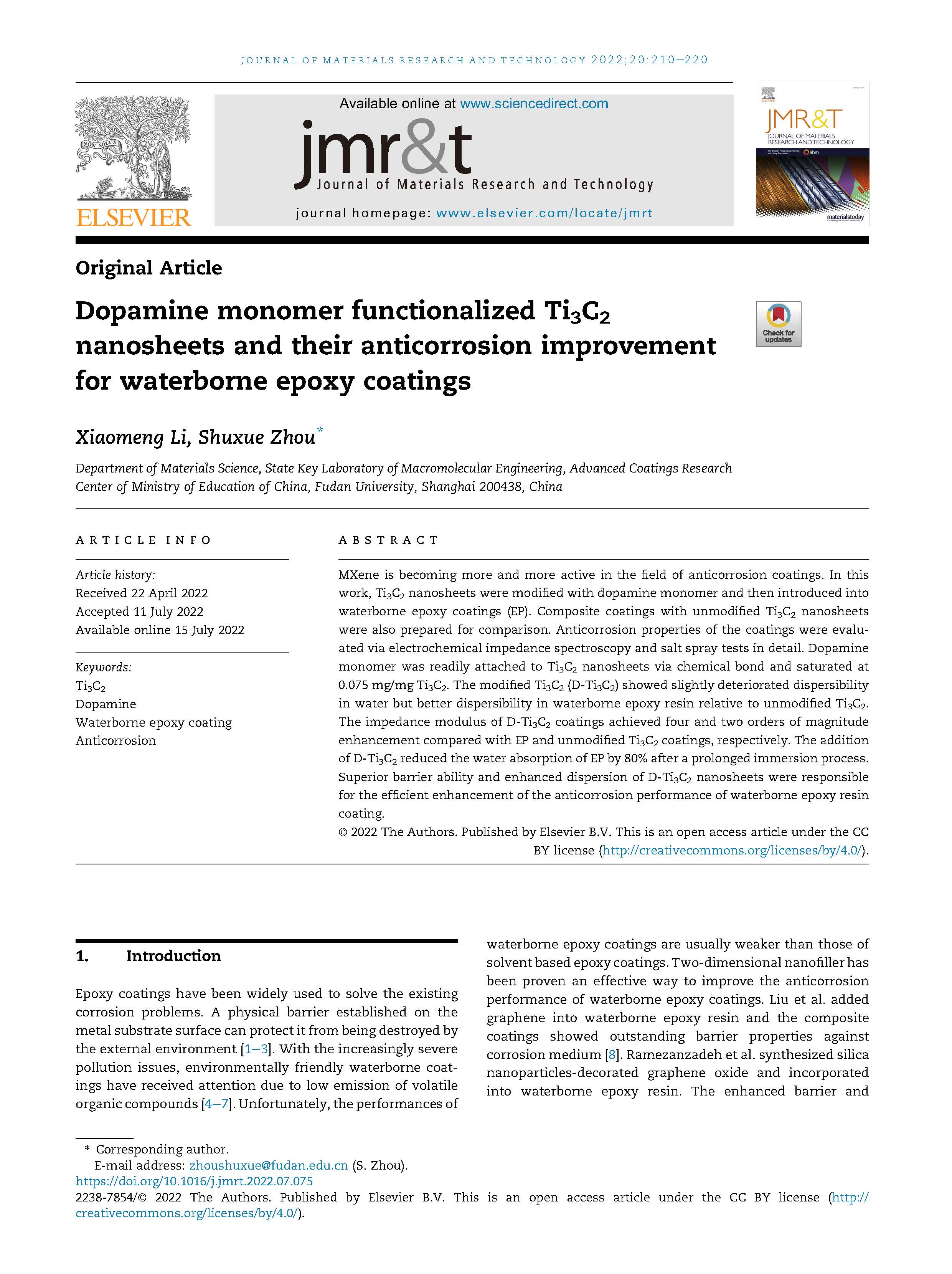 MXene在防腐涂料领域的研究越来越广泛。本工作采用多巴胺单体来修饰Ti3C2纳米片,并将其引入水性环氧涂料中(EP),同时制备了未改性Ti3C2纳米片的复合涂层进行比较。 通过电化学阻抗谱和盐雾试验对涂层的防腐性能进行了详细评价。 多巴胺单体很容易通过化学键附着在Ti3C2纳米片上,并在0.075 mg/mg Ti3C2浓度下饱和吸附。 与未改性Ti3C2相比,改性Ti3C2纳米片(D-Ti3C2)在水中的分散性略差,但在水性树脂中分散性更佳。D-Ti3C2涂层的阻抗模量比EP和未改性Ti3C2涂层分别提高了4个和2个数量级。 D-Ti3C2的加入使EP在长时间浸泡后的吸水率降低了80%。 D-Ti3C2纳米片优异的阻隔能力和在树脂基体中良好的分散性是提高EP涂层防腐性能的主要原因。