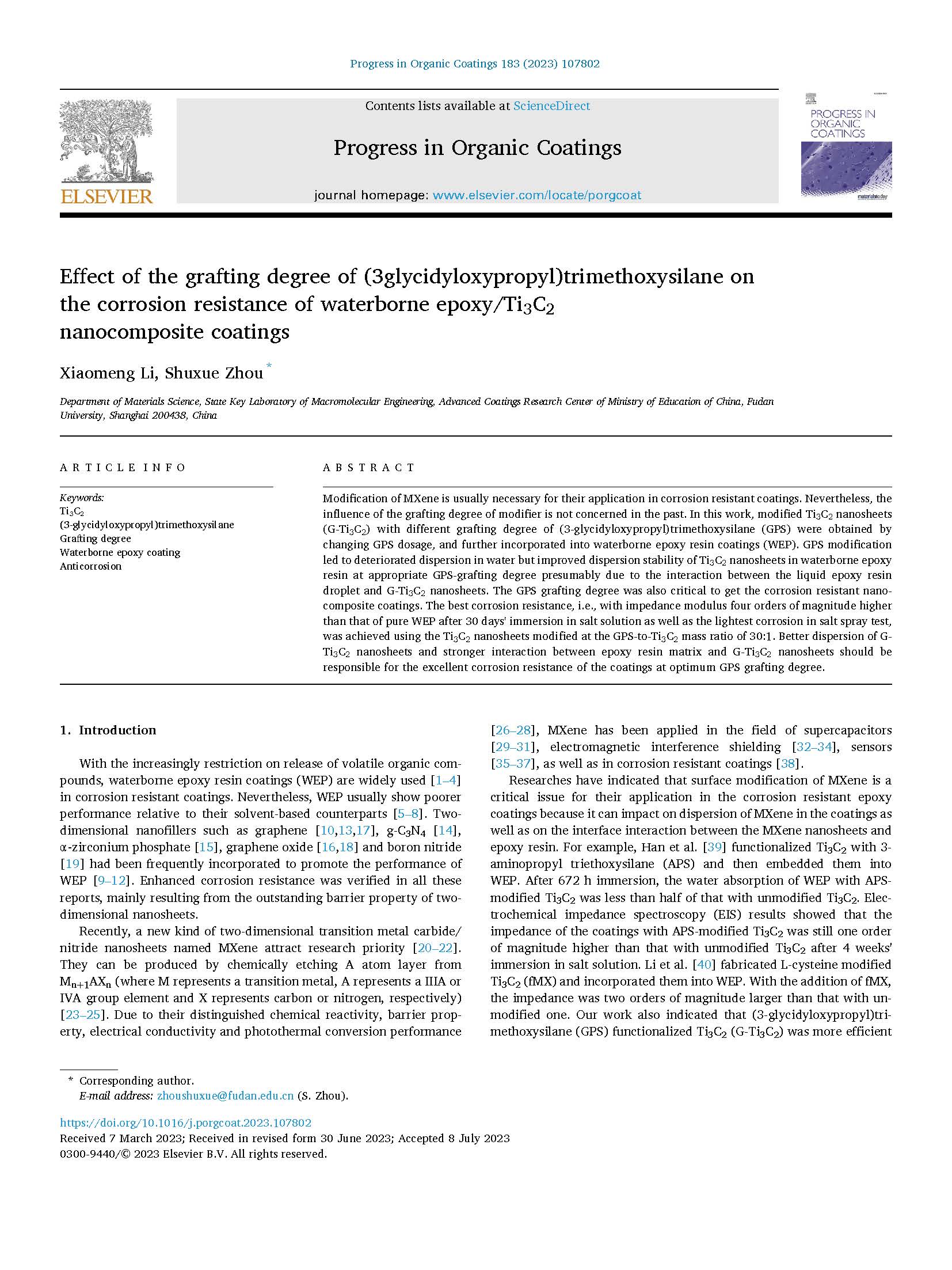 MXene的改性对于涂层防腐性能的提升通常是很有必要的。 然而在以往的研究中,改性剂的接枝程度对改性的影响并未得到重视。 本研究通过改变GPS的添加量,得到了不同接枝率的(3-缩水甘油基氧基丙基)三甲氧基硅烷(GPS)改性Ti3C2纳米片(G-Ti3C2),并将其加入到水性环氧树脂涂料(WEP)中。 GPS改性导致了Ti3C2纳米片在水中的分散变差,但在适当的GPS接枝率下,G-Ti3C2纳米片在水性环氧树脂中的分散稳定性得到了改善。这可能是由于液态环氧树脂液滴与G-Ti3C2纳米片的相互作用所致。 GPS接枝率也是提升涂层防腐性能的关键。 当GPS-Ti3C2质量比为30:1时,G-Ti3C2纳米片在NaCl溶液中浸泡30天后的耐蚀性能最佳,阻抗模量比纯WEP高4个数量级,并且盐雾试验后腐蚀情况最轻微。 G-Ti3C2纳米片良好稳定的分散性和与环氧树脂基体之间较强的相互作用,是涂层在最佳GPS接枝率下具有优异耐蚀性能的原因。