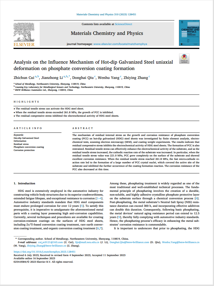 通过有限元分析、电化学试验、扫描电子显微镜(SEM)和镀层重量实验,研究了残余内应力对热镀锌(HDG)钢板上磷酸盐转化涂层(PCC)生长和耐蚀性的影响机制。结果表明,残余压应力抑制了HDG钢板的电化学活性。PCC的形成也受到抑制。残余拉应力可以有效地提高基体的电化学活性,并且随着残余拉应量的增加,基体的阴极反应速率增加。特别是,当残余拉应力值为221.0MPa时,PCC在基材表面完全生长,并表现出优异的耐腐蚀性。当残余拉应力达到261.8MPa时,快速的微阴极再作用速率导致大量PCC晶核的形成,PCC晶核覆盖了基体的活性位点,抑制了涂层形成反应的进一步发生。PCC的耐腐蚀性也在此时降低。