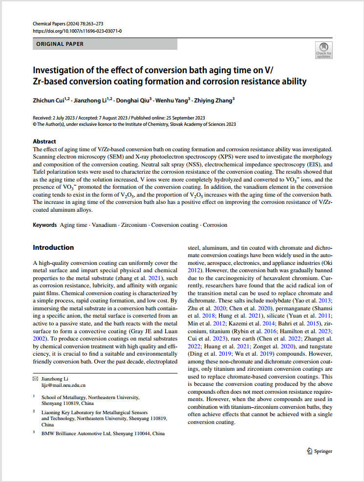 研究了V/Zr基转化浴的时效时间对涂层形成和耐腐蚀性能的影响。利用扫描电子显微镜(SEM)和X射线光电子能谱(XPS)研究了转化涂层的形貌和组成。使用中性盐雾(NSS)、电化学阻抗谱(EIS)和塔菲尔极化试验来表征转化涂层的耐腐蚀性。结果表明,随着溶液老化时间的增加,V离子更完全地水解并转化为VO3−离子,VO3−的存在促进了转化涂层的形成。此外,转化涂层中的钒元素倾向于以V2O5的形式存在,并且V2O5比例随着转化浴的老化时间而增加。转化浴老化时间的增加对提高V/Zr涂层铝合金的耐腐蚀性也有积极作用。