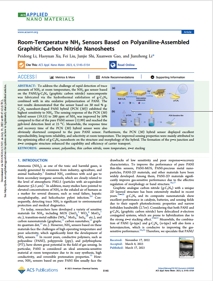 为了应对在室温下快速检测痕量NH3的挑战,通过g-C3N4的水热剥离和PANI的原位氧化聚合,制备了基于PANI/g-C3N4(石墨氮化碳)纳米复合材料的NH3气体传感器。测试结果表明,基于30mol%g-C3N4纳米片掺杂的PANI杂化物(PCN(30))的传感器对NH3表现出最高的灵敏度。与纯PANI传感器(12.99)相比,PCN(30)混合传感器(19.53)对200 ppm NH3的传感响应提高了50%,并在25°C时达到ppb水平的检测极限。同时,与纯PANI传感器相比,PCN(30)混合传感器的响应时间和恢复时间也明显缩短。此外,PCN(30)混合传感器在室温下表现出优异的再现性、长期可靠性和选择性。传感性能的提高主要归功于g-C3N4纳米片对杂化物结构和形貌的优化作用。p−n结和π-π共轭结构的形成增强了载流子传输的能力和效率。