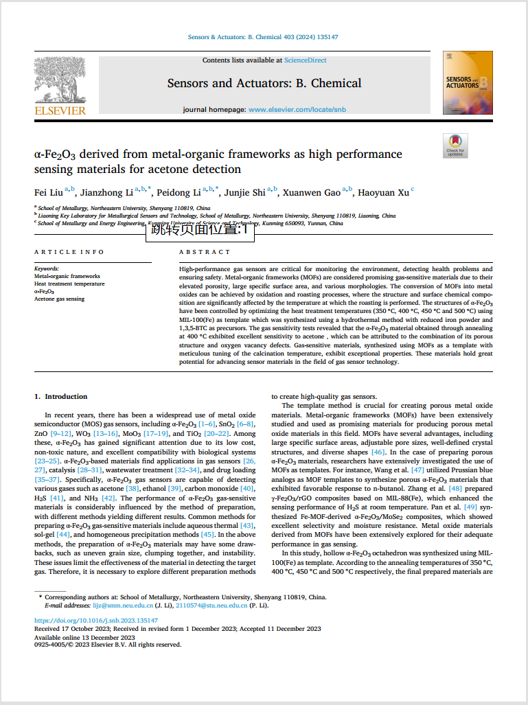 源自金属有机框架的α-Fe2O3作为丙酮检测的高性能传感材料高性能气体传感器对于监测环境、检测健康问题和确保安全至关重要。金属有机框架(MOFs)由于其较高的孔隙率、大的比表面积和多种形态而被认为是有前途的气敏材料。MOFs转化为金属氧化物可以通过氧化和焙烧过程实现,其中结构和表面化学成分显著受焙烧温度的影响。通过优化热处理温度(350℃、 400℃、 450℃和500℃) 以MIL-100(Fe)为模板,以还原铁粉和1,3,5-BTC为前驱体,采用水热法合成。气敏试验表明,经400℃退火得到的α-Fe2O3材料对丙酮表现出优异的敏感性,这可归因于其多孔结构和氧空位缺陷的结合。使用MOFs作为模板,通过仔细调整煅烧温度合成的气敏材料表现出非凡的性能。这些材料在气体传感器技术领域具有巨大的发展传感器材料的潜力。