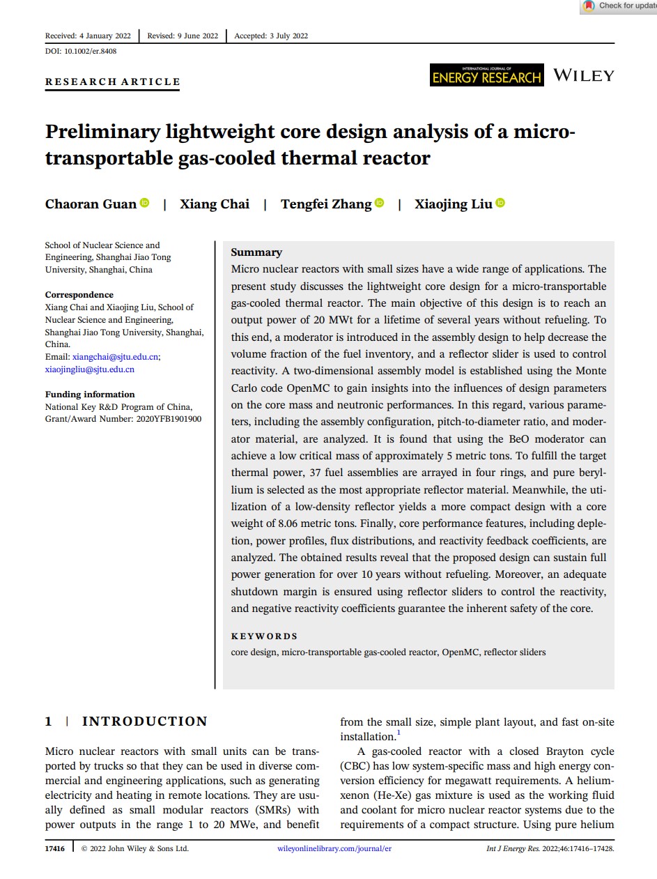 小型微型核反应堆有着广泛的应用。本研究讨论了微型可运输气冷堆的轻量化堆芯设计,该设计的主要目标是在不换料的情况下,在使用寿命内达到20 MWt的输出功率。为此,在组件设计中引入了慢化剂,以帮助降低燃料的体积分数,并使用反射层滑块来控制反应性。使用蒙特卡罗程序OpenMC建立了二维组件模型,以深入了解设计参数对堆芯质量和中子性能的影响。在这方面,分析了各种参数,包括组件配置、节径比和慢化剂材料。使用BeO慢化剂可以实现大约5吨的低临界质量。为了实现目标热功率,37个燃料组件排列成四个环,为了实现目标功率,37种燃料组件排列在四个环中,并且选择纯铍作为最合适的反射层材料。同时,低密度反射层的使用产生了更紧凑的设计,其堆芯重量为8.06吨。最后,分析了堆芯中子性能,包括燃耗、功率分布、通量分布和反应性反馈系数。结果表明,所提出的设计可以在不换料的情况下维持满功率发电10年以上。此外,使用反射层滑块来控制反应性,确保了足够的停堆裕度,负反应性系数保证了堆芯的固有安全性。