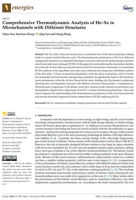 He-Xe的摩尔质量为40g/mol,被认为是空间限制布雷顿循环中最有前途的工作介质之一。本文研究了He-Xe在不同构型通道中的热力学性能,为印制电路板板式换热器(PCHE)的优化设计提供依据。本文从流动传热机理出发,分析了影响He-Xe流场温度分布的因素。发现对数区和外区的流型决定了流场的温度分布模式。一系列的数值模拟验证了上述结论,发现合理的通道结构和操作条件可以显著提高He-Xe流的热力学性能。基于上述研究结果,对Zig通道进行优化,得到具有不同结构特性的Sine和Serpentine通道。对通道内部的氦-氙流动区域进行了全面的热力学比较,发现形状因子为tan52.5°的Serpentine通道具有最佳的性能。本工作旨在提高对He-Xe在微通道内热力学性能的认识,为进一步利用He-Xe优化PCHE提供理论支持。