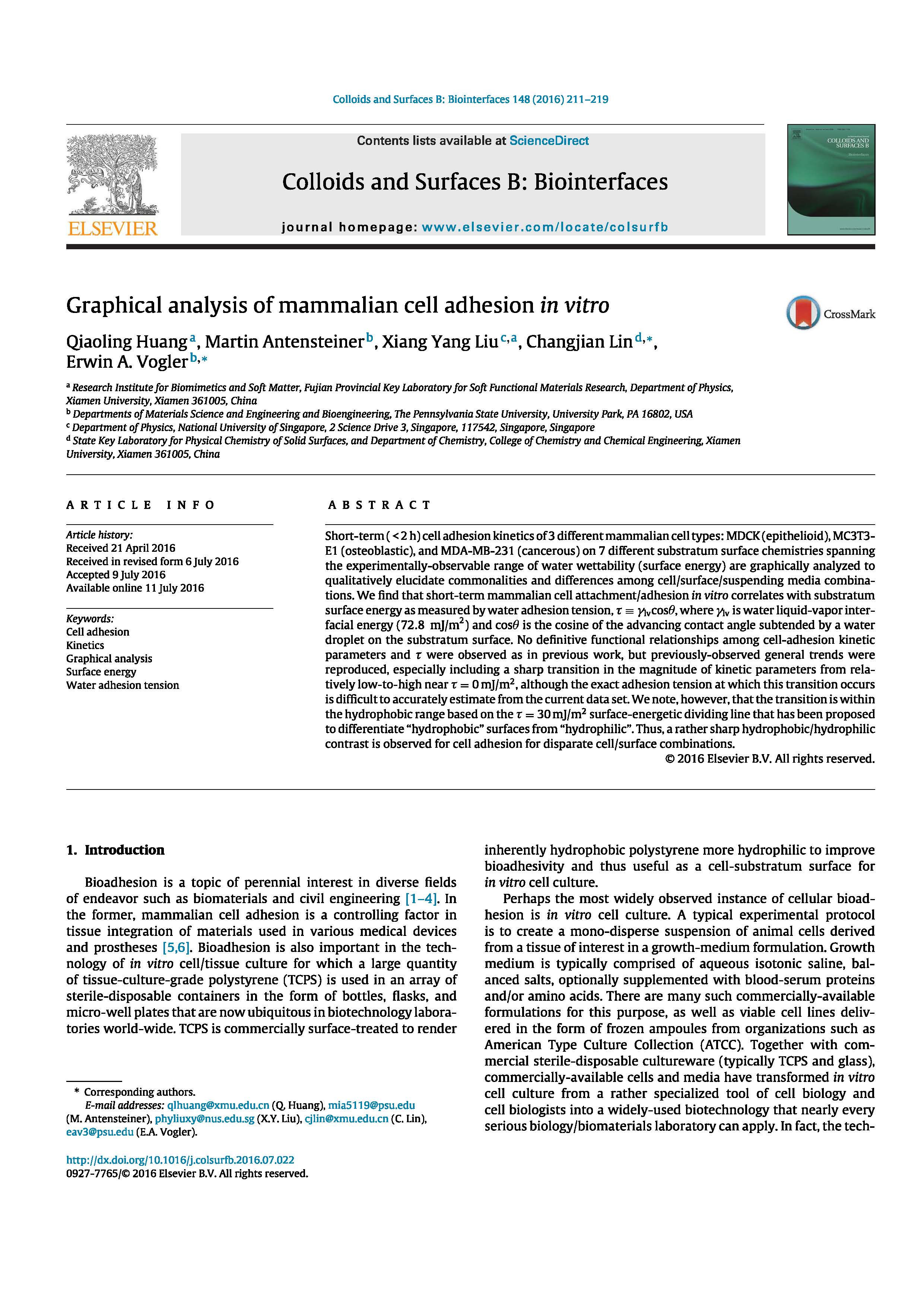 我们对三种不同哺乳动物的细胞(上皮样细胞MDCK、成骨细胞MC3T3和癌细胞MDA-MB-231)在七种具有不同表面化学成分且具有较大水润湿性(表面能)差异的样品上短期黏附(<2h)的动力学进行了图形分析,定性地阐明细胞/表面/悬浮介质组合之间的共同特点和差异。我们发现哺乳动物细胞在体外的黏附与样品的表面能有关,其中表面能用水的附着张力测量,τ=γlv·cosθ, 该式中γlv为液体和气体之间的界面能(72.8 MJ/m2),cosθ是水滴在样品表面前进接触角θ的余弦。与以前这方面的工作所观察到的一样,没有发现细胞黏附动力学参数之间的确定函数关系,但是复现了以前观察到的一般趋势,特别是包括动力学参数的大小从相对较低到较高(接近τ=0 mJ/m2)的急剧转变,尽管发生这种转变的确切黏附张力很难从当前的数据集中准确地估计出来。然而我们注意到,这种转变发生在基于τ=30 mJ/m2的表面能分界线的疏水范围内,这条分界线被用来区分“疏水”和“亲水”表面。因此,对于不同的细胞/表面组合,我们观察到细胞黏附在疏水/亲水形成强烈的对比。