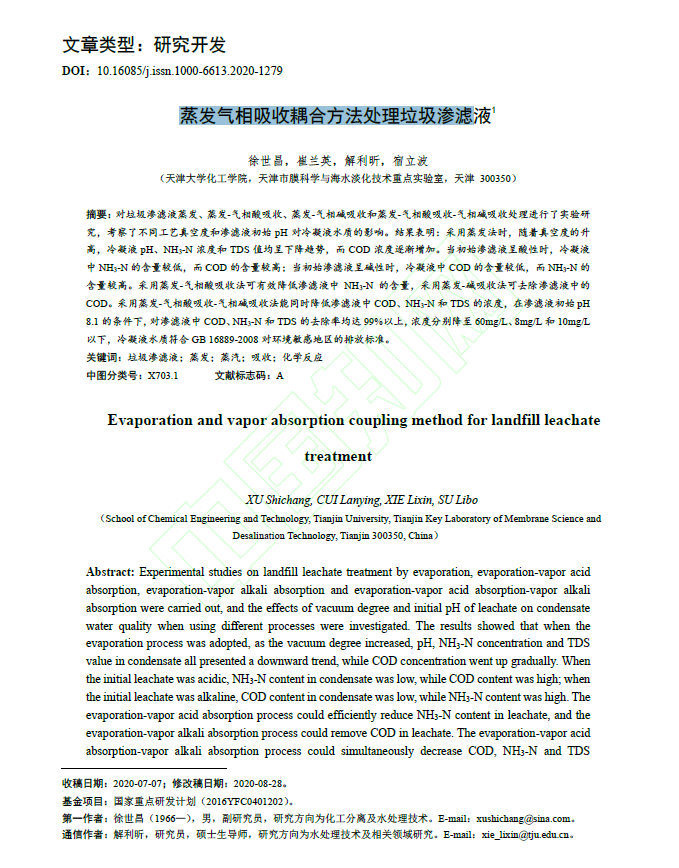 对垃圾渗滤液蒸发、蒸发-气相酸吸收、蒸发-气相碱吸收和蒸发-气相酸吸收-气相碱吸收处理进行了实验研究,考察了不同工艺真空度和渗滤液初始pH 对冷凝液水质的影响。结果表明:采用蒸发法时,随着真空度的升高,冷凝液pH、NH3-N 浓度和TDS 值均呈下降趋势,而COD 浓度逐渐增加。当初始渗滤液呈酸性时,冷凝液中NH3-N 的含量较低,而COD 的含量较高;当初始渗滤液呈碱性时,冷凝液中COD 的含量较低,而NH3-N 的含量较高。采用蒸发-气相酸吸收法可有效降低渗滤液中NH3-N 的含量,采用蒸发-碱吸收法可去除渗滤液中的COD。采用蒸发-气相酸吸收-气相碱吸收法能同时降低渗滤液中COD、NH3-N 和TDS 的浓度,在渗滤液初始pH8.1 的条件下,对渗滤液中COD、NH3-N 和TDS 的去除率均达99%以上,浓度分别降至60mg/L、8mg/L 和10mg/L以下,冷凝液水质符合GB 16889-2008 对环境敏感地区的排放标准。