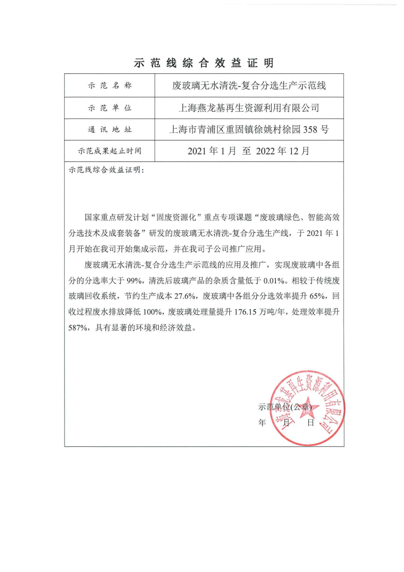 废玻璃无水清洗-复合分选生产线综合效益证明