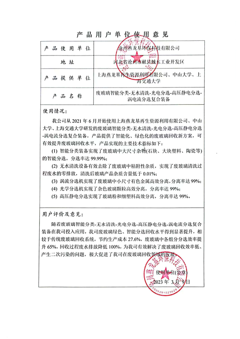 废玻璃回收仪器装备用户单位使用意见-沧州公司
