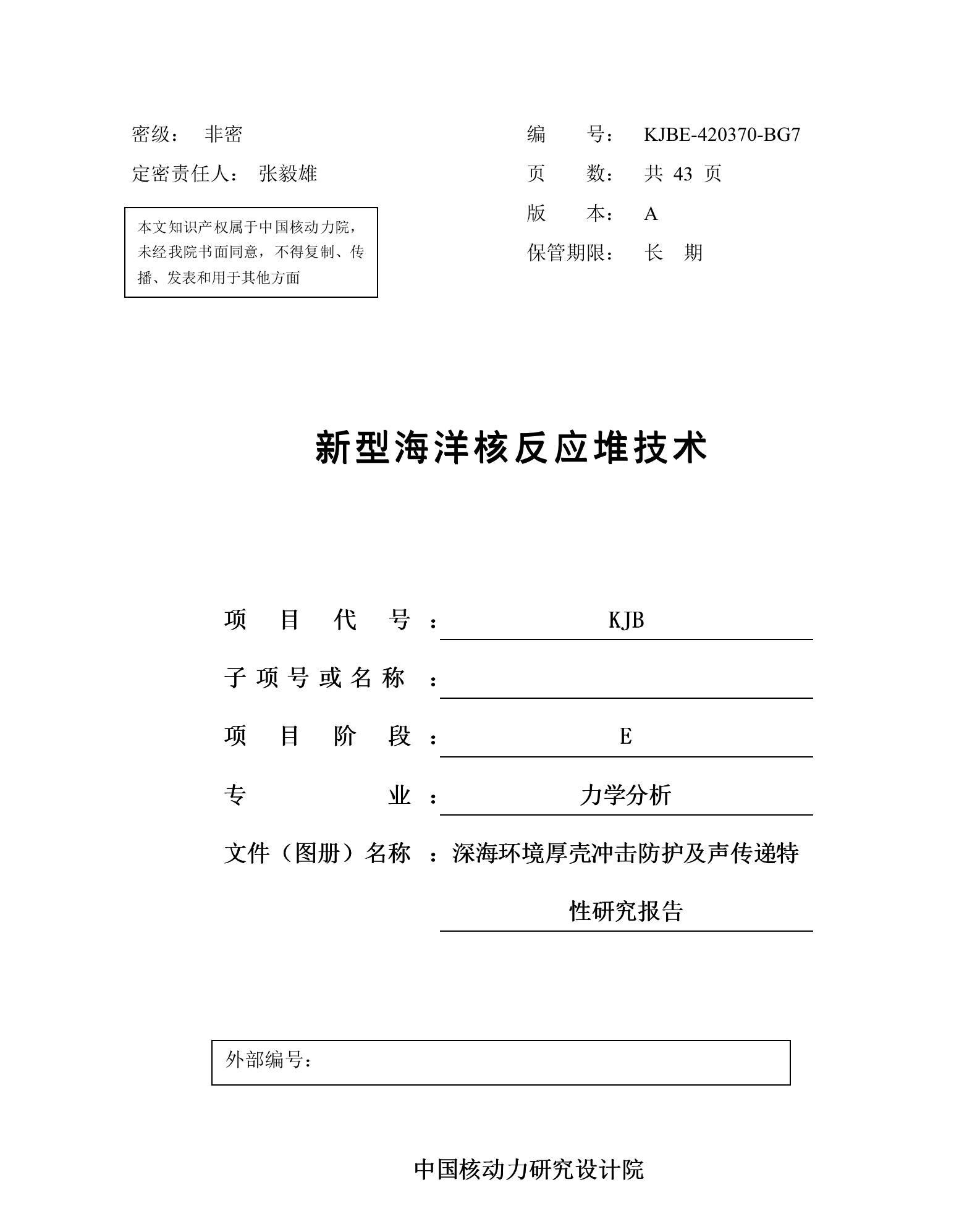 本报告对深海环境厚壳冲击防护和声传递(振动)特性进行了研究,主要为深海环境下外压对厚壳的冲击防护会产生影响;水下爆炸冲击波会沿着爆炸源点到爆距点的方向,从壳体迎爆面向壳体背爆面以球面波的形式传递,冲击波传递过程中壳体迎爆面附近先发生空化现象,且空化区域不断扩大,随着冲击波的传递,壳体背爆面也会发生空化现象;在冲击条件下,厚壳内部有内域(水流体)相比无内域(仅空气)对厚壳的加速度、速度和位移均产生明显影响;在冲击条件下,厚壳在动态下三个方向上的加速度和静态下厚壳的加速度变化;当流体介质由水变为铅铋合金时,在靠近主泵激励源处、反应堆压力容器与耐压壳连接处的振动加速度总级的变化;当叶轮转速从500rpm增大到1000rpm时,在靠近主泵激励源处、反应堆压力容器与耐压壳连接处的振动加速度总级的变化;不同流场流速下,在靠近主泵激励源处、反应堆压力容器与耐压壳连接处的振动加速度总级的变化等。