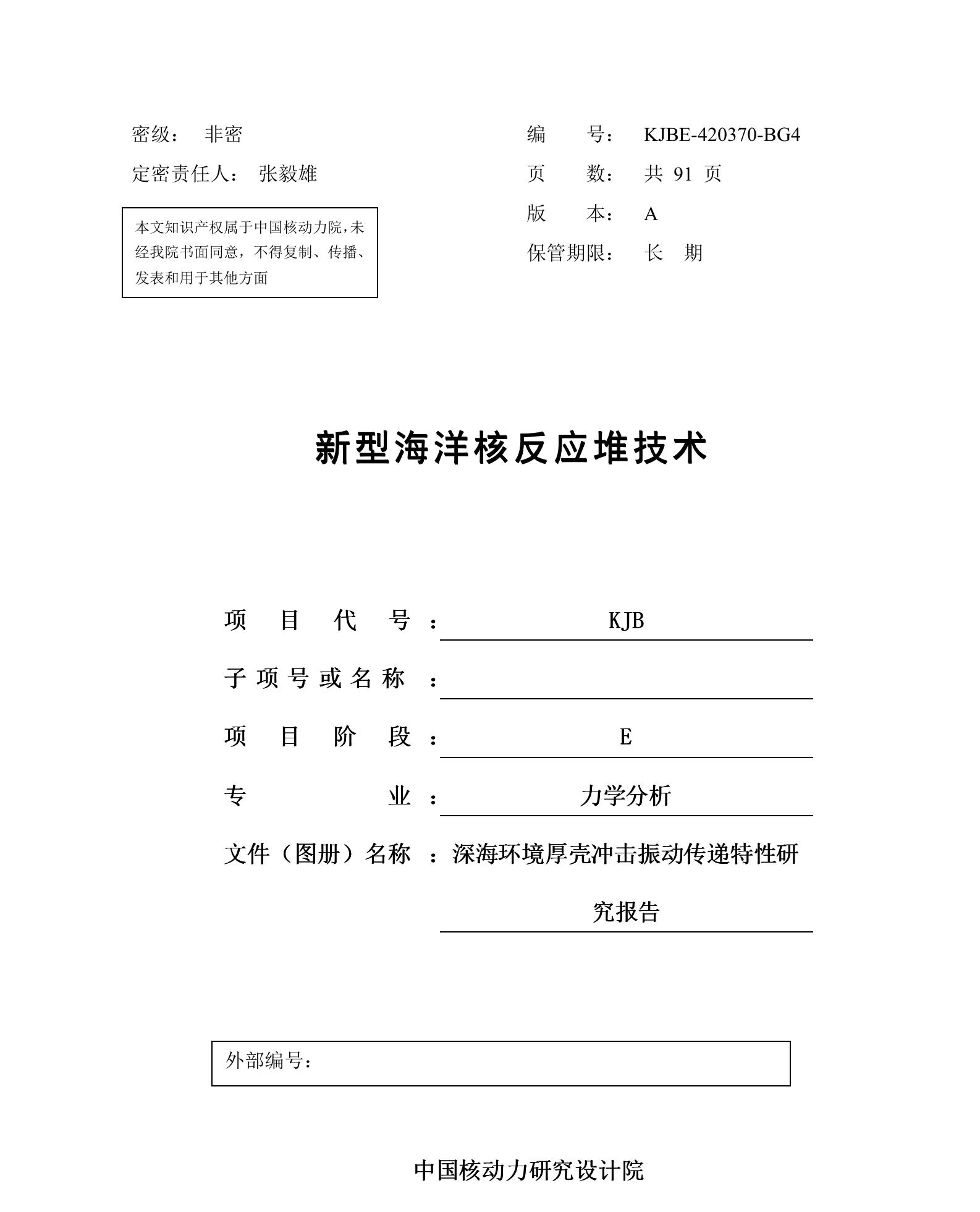 本报告对深海环境厚壳冲击振动传递特性进行了研究,主要为在所给的冲击载荷下,厚壳上应力响应随时间变化的趋势;堆内构件外层壳体测点加速度峰值情况;当流体介质由水变为铅铋合金时,在靠近主泵激励源处、反应堆压力容器与耐压壳连接处的振动加速度总级的变化;当叶轮转速从500rpm增大到1000rpm时,在靠近主泵激励源处、反应堆压力容器与耐压壳连接处的振动加速度总级的变化;不同流场流速下,在靠近主泵激励源处、反应堆压力容器与耐压壳连接处的振动加速度总级的变化;考虑设置隔振器进行减振,设置隔振器后耐压壳振动加速度总级的变化;考虑静水压力和不考虑静水压力,分别在冲击载荷作用下和在振动激励下,对厚壳的最大应力、等效塑性应变、加速度和位移响应的影响等。