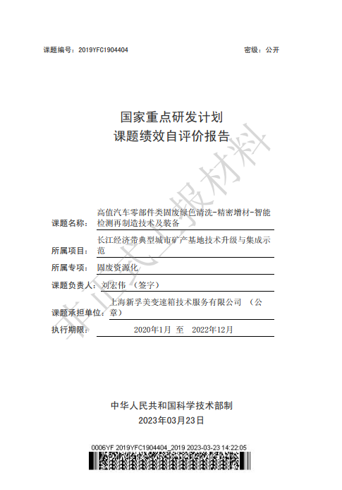 课题依照任务书要求,深入开展了面向高值汽车零部件再制造的激光绿色清洗、再制造零件损伤检测、再制造材料体系设计开发、高速激光增材再制造及再制造建模与路径规划等技术研究,研制了桌面型高通量等离子旋转电极雾化制粉装置(PREP,转速 50798r/min)、大型非转移弧等离子旋转电极雾化制粉装置(转速 30247r/min)及自动变速箱总成动态综合检测设备 3 套,建成了变速箱、转向器等汽车高值零部件再制造示范生产线,具备变速箱、转向器等高值汽车零部件年再制造生产能力 22766 台,再制造率为 94.83%,成本下降 23.03%。 依托课题研究,发表学术论文 1 篇,申请国家发明专利 11 件、实用新型专利 4 件,其中获授权发明专利 3件、实用新型专利 3 件;制订国家标准 2项、团体标准 5 项;制订技术工艺规范4 项。