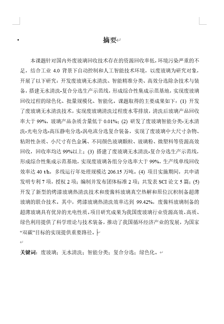 本课题针对国内外废玻璃回收技术存在的资源回收率低,环境污染严重的不足,结合工业4.0背景下自动控制和人工智能技术环境,以废玻璃为研究对象,开展了以下研究:开发废玻璃无水清洗、智能精准分类、高效分选除杂技术与装备,搭建无水清洗-复合分选生产示范线,形成综合性集成示范基地,实现废玻璃回收过程的绿色化、批量规模化、智能化。课题取得的主要成果如下:(1) 开发了废玻璃无水清洗技术,实现废玻璃清洗过程废水零排放,清洗后玻璃产品回收率大于99%,玻璃产品杂质含量低于0.01%;(2) 研发了废玻璃智能分类-无水清洗-光电分选-高压静电分选-涡电流分选复合装备,实现了废玻璃中大尺寸杂物、粘附性杂质、小尺寸有色金属、不同颜色玻璃颗粒、玻璃粉、微塑料等资源高效回收,回收率均达99%以上;(3) 搭建了废玻璃无水清洗-复合分选生产示范线,形成综合性集成示范基地,实现废玻璃各组分分选率大于99%,生产线单线回收效率达40 t/h,多线运行年处理规模达206.15万吨。(4) 项目实施期间,共申请发明专利7项,授权2项;编制并发布团体标准2项;共发表SCI论文5篇;(5) 开发了新型的烤漆玻璃热清洗技术和废酱料玻璃真空热解和原位沉积制备超薄玻璃的联合技术。其中,烤漆玻璃热清洗效率达到99.42%,废酱料玻璃制备的超薄玻璃具有优异的光电性质。项目研究成果为我国废玻璃行业资源高效、高质、绿色利用提供了科学理论与技术装备,推动了我国循环经济产业的发展,为国家“双碳”目标的实现提供重要路径。