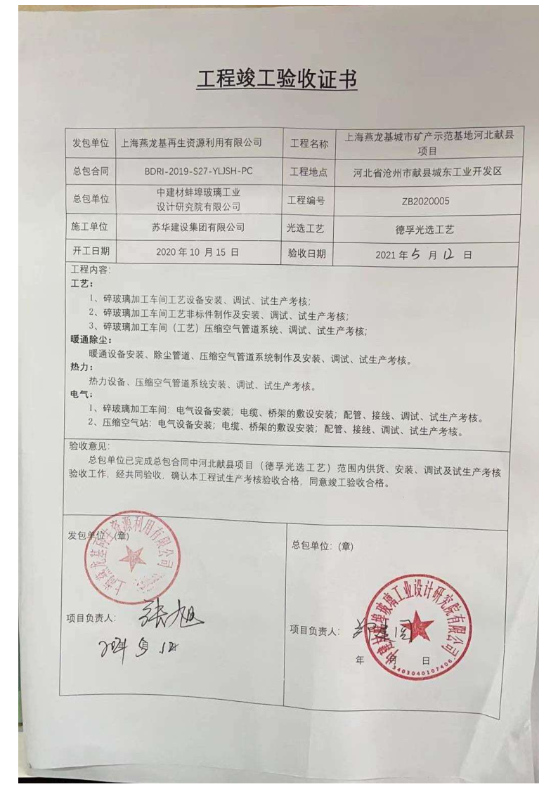 废玻璃无水清洗-复合分选生产线-沧州公司验收证书