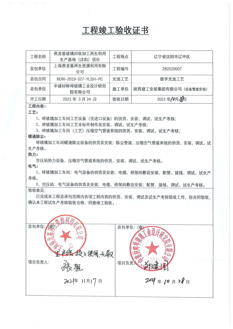 废玻璃无水清洗-复合分选生产线-沈阳公司验收证书