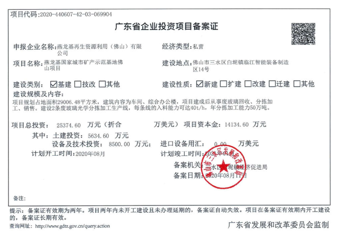 废玻璃无水清洗-复合分选生产线投资项目备案证-佛山公司