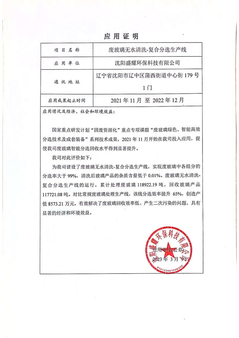废玻璃无水清洗-复合分选生产线推广应用证明-沈阳公司