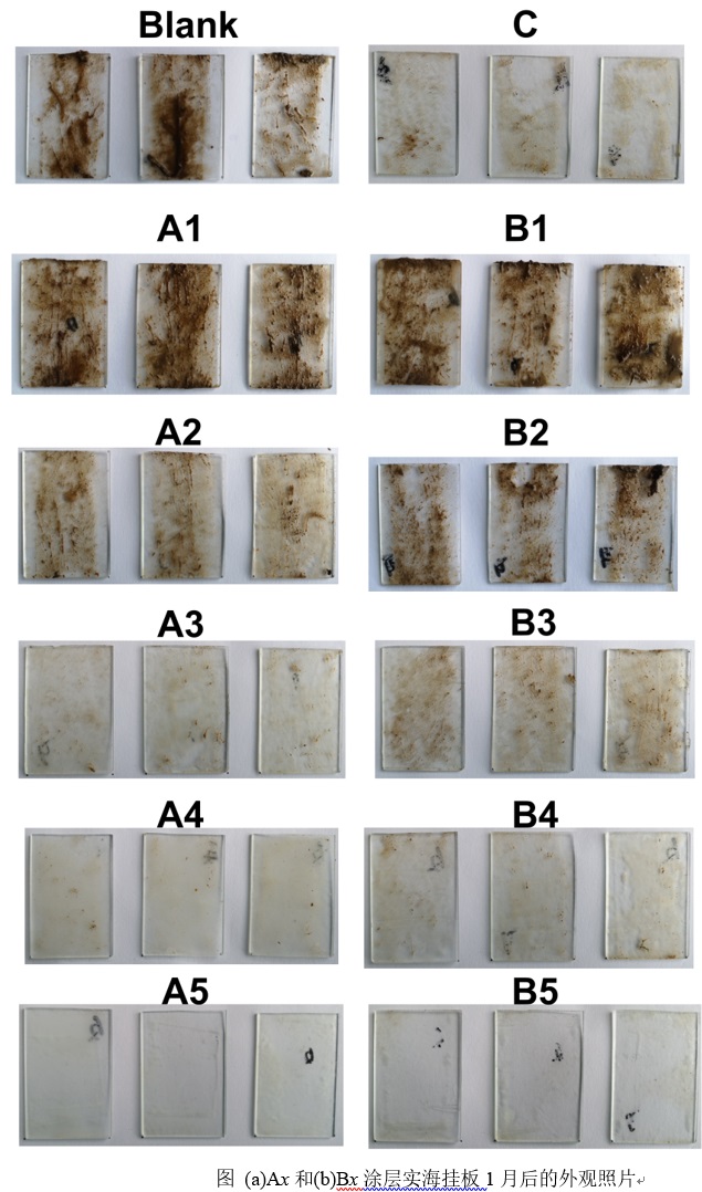 该涂层由TEOS与MAPS预水解形成的两性离子溶胶(h-MAPS)、催化剂和羟基硅油(两种粘度)复合而成。本报告为涂层的海洋挂板照片。