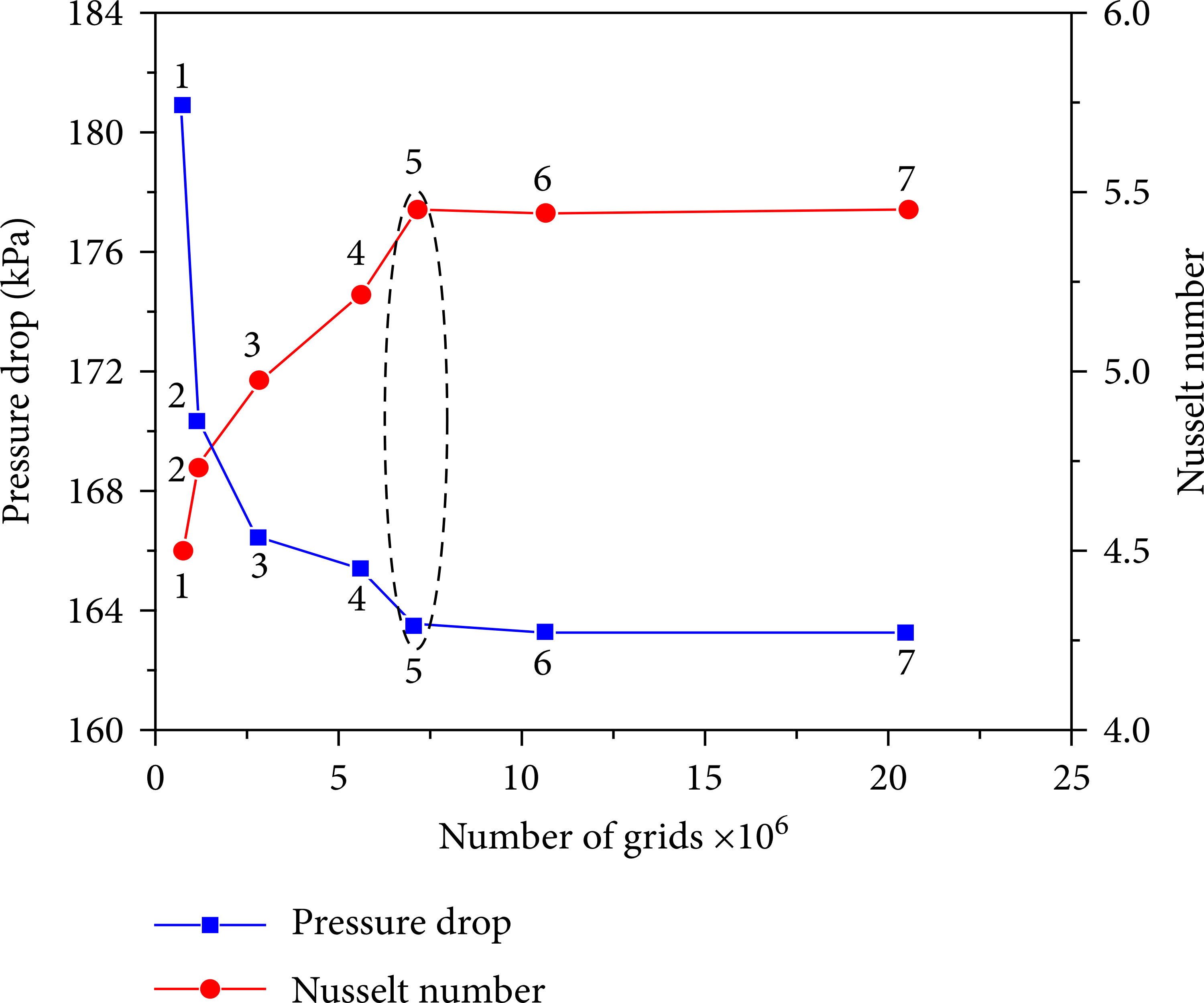 A grid independence test is first carried out to obtain the optimum grid number for the zigzag PCHE unit model. Seven different grid sizes are analyzed in the mesh independence test. Compared to the number of mesh grids of 2.04× 107 (mesh 7), the maximum relative deviation of the pressure drop and the Nusselt number of the grid system of 6.86× 106 (mesh 5) is less than 1.0%. Therefore, mesh 5 will be used for numerical calculations. In the fluid zones, dense grids are established, while in the solid regions, coarse grids are used. The boundary grid has five layers, the first of which has a height of 0.01 mm and a growth rate of 1.2 near the wall.