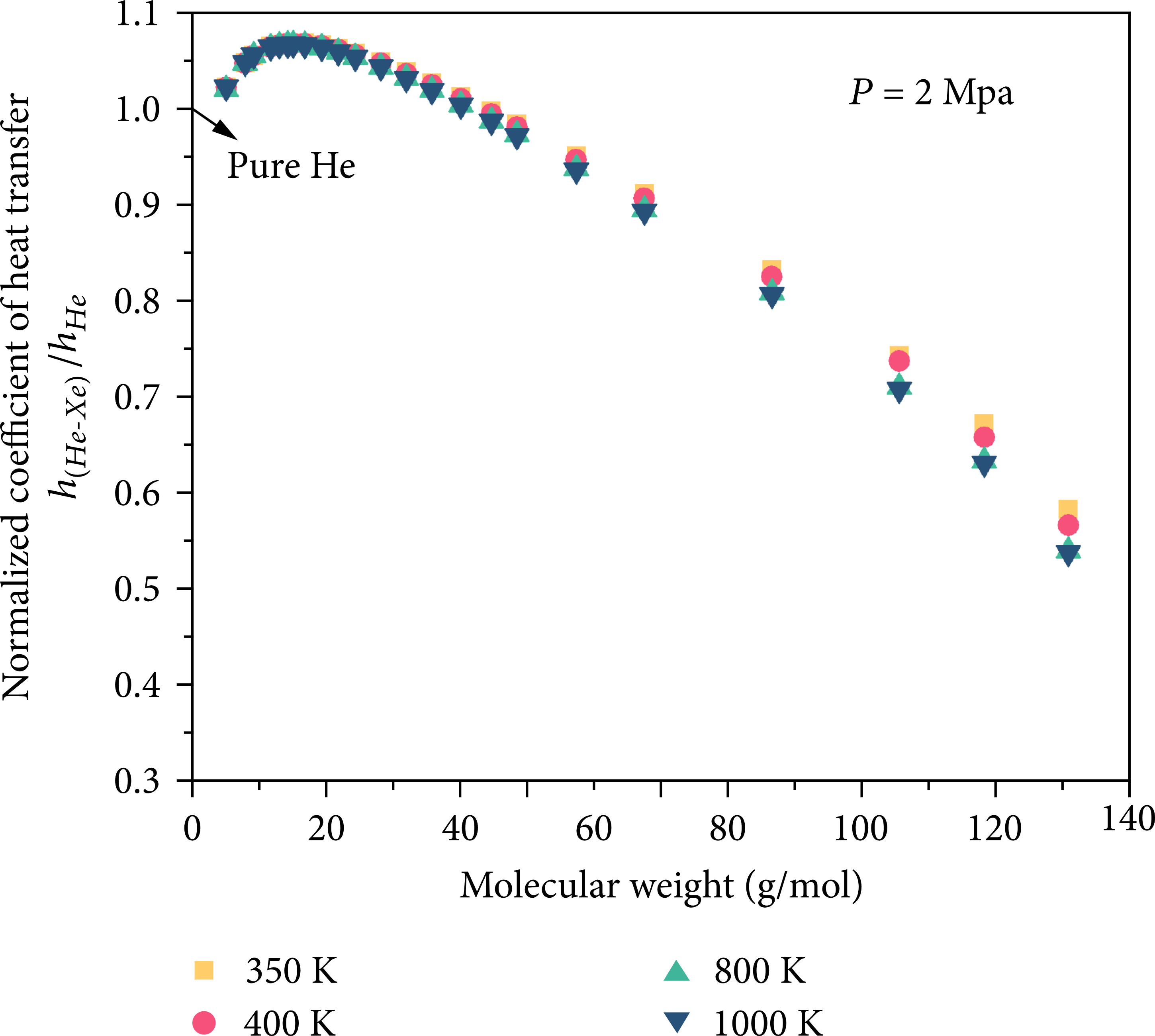 The influence of the molar mass of the mixture on its relative convective heat transfer coefficient at different temperatures and pressures. One can see that temperature and pressure have little influence on the relative convective heat transfer coefficient. When mHe-Xe is 15 g/mol, the heat transfer coefficient of the gas mixtures is 6.3% higher than pure He. A higher heat transfer efficiency can be achieved by choosing a medium with a higher heat transfer coefficient. Therefore, we choose He-Xe at 15 g/mol as the medium.