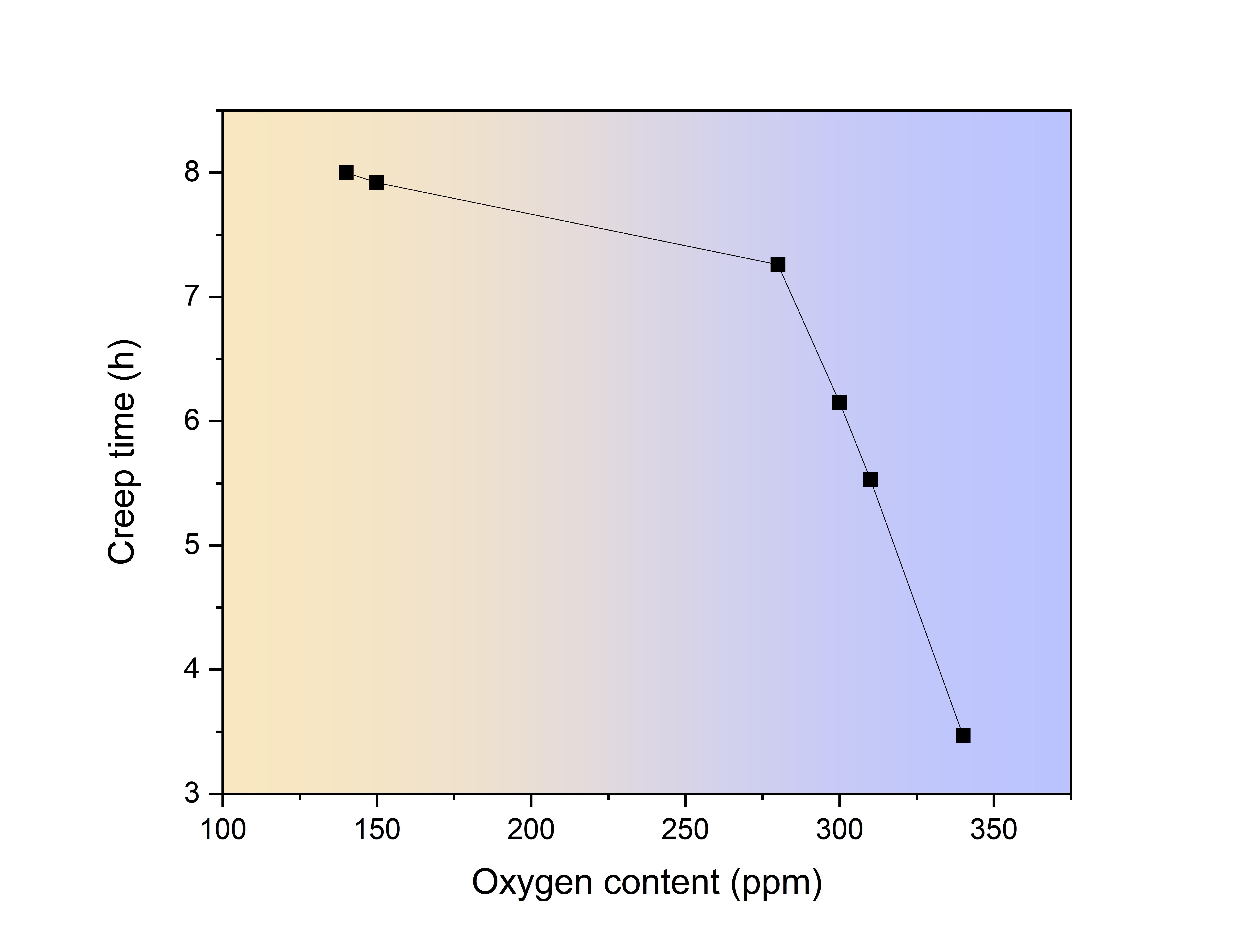 For the FGH96 alloy after the optimized microstructure, creep experiments at 700 ° C and 690 MPa were carried out on the electronic creep testing machine (RDL100, SINOTEST). The time required for alloys with different oxygen contents to reach a residual strain of 0.2% was statistically analyzed, and the critical oxygen content for the sudden change in creep life of the alloys was analyzed.
